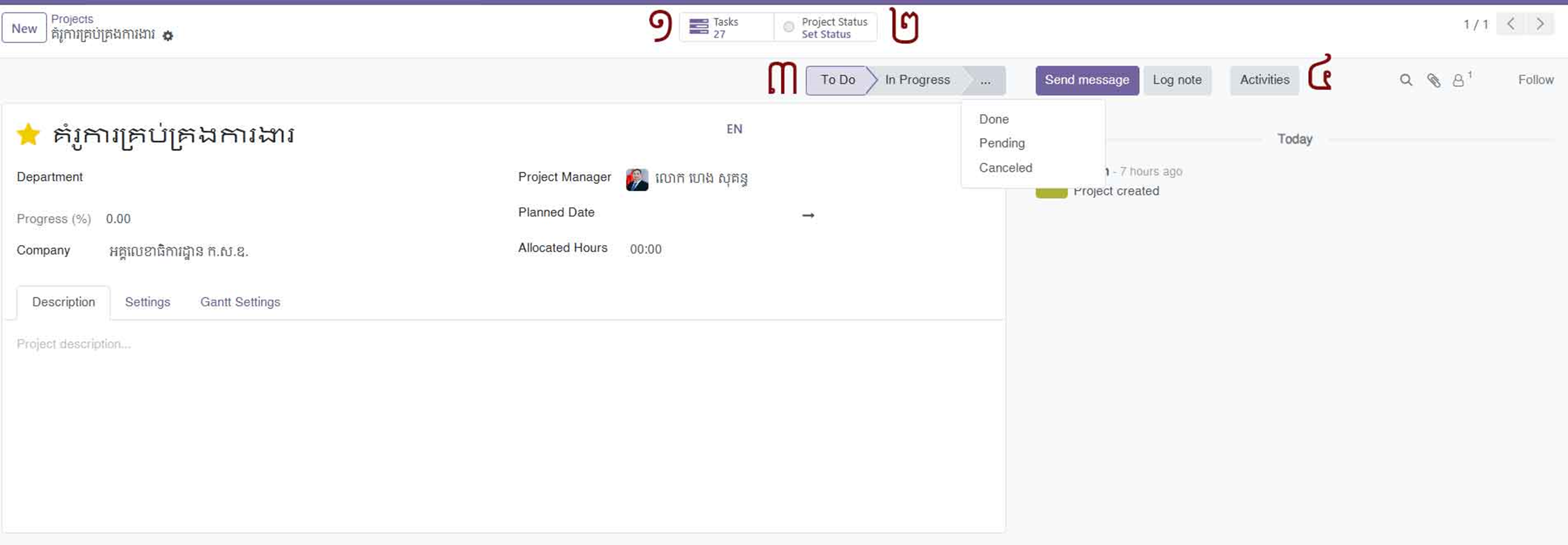 ចំនុច៤ គឺជាសារ(Send Message) ការកំណត់សម្គាល់បន្ថែម(Log note) ជាសកម្មភាព(Activities) អាចស្វែងរក សារដែលបានSend ,    អាចភ្ជាប់ជាAttachment
