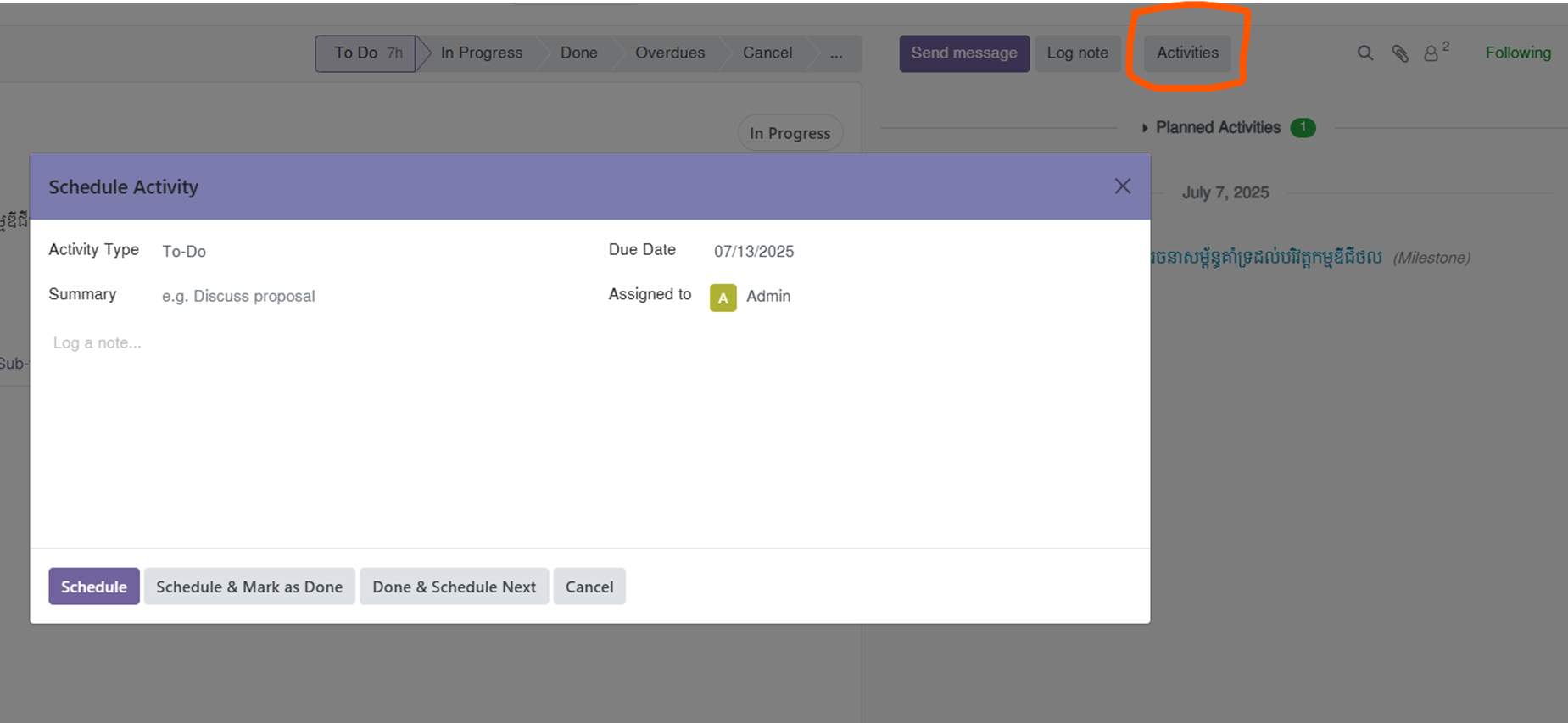 => Schedule & Mark as Done (កំណត់ពេល & សម្គាល់ថារួចរាល់)៖ កំណត់ពេលសកម្មភាព ហើយសម្គាល់ភ្លាមៗថាបានបញ្ចប់។ មានប្រយោជន៍នៅពេលសកម្មភាពសាមញ្ញ ហើយអាចបញ្ចប់ភ្លាមៗ។
